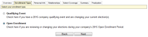 • Open Enrollment. If your organization is having a benefit open enrollment, choose the Open Enrollment option. Click Next to continue.
